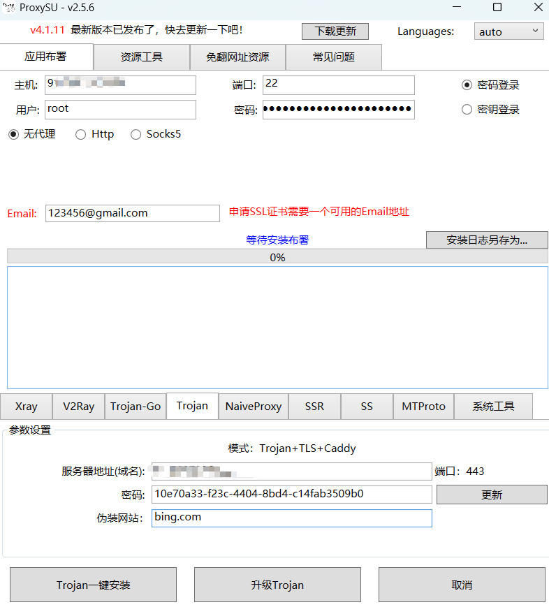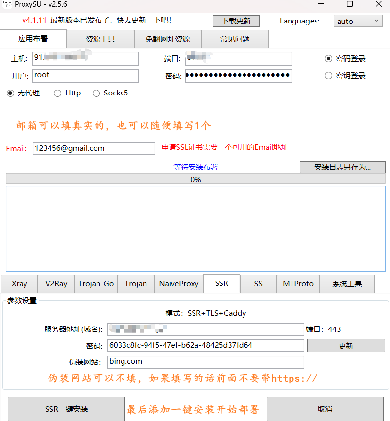 填上ip和密码,端口22和root默认。注意:ProxySU-v2.5.7版本,就算没有域名,在界面上也需要填写1个邮箱,可以是真实的,也可以随便填写1个,比如[email protected] 不然软件无法正常运行。