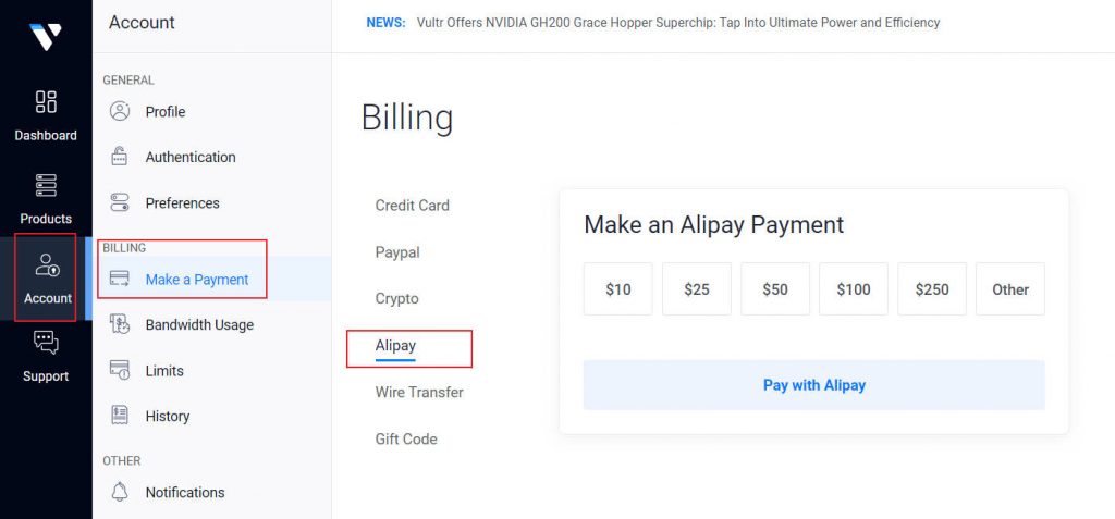 vultr实际上是折算成小时来计费的,比如服务器是5美元1个月,那么每小时收费为5/30/24=0.0069美元 会自动从账号中扣费,只要保证账号有钱即可。如果你部署的服务器实测后速度不理想,你可以把它删掉(destroy),重新换个地区的服务器来部署,方便且实用。因为新的服务器就是新的ip,所以当ip被墙时这个方法很有用。当ip被墙时,为了保证新开的服务器ip和原先的ip不一样,先开新服务器,开好后再删除旧服务器即可。在账号的Billing选项里可以看到账户余额。
