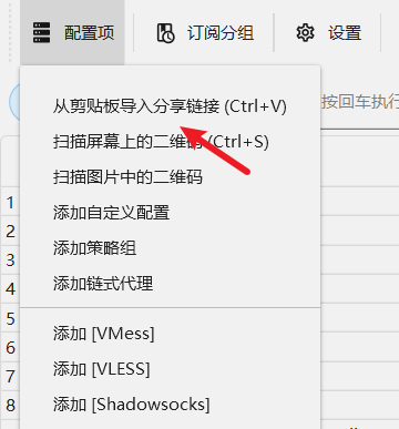复制节点一键导入链接后,选择“从剪贴板导入分享链接”即可把节点导入到软件中,可以批量导入。或者也可以通过扫描二维码或者手动填写节点信息。