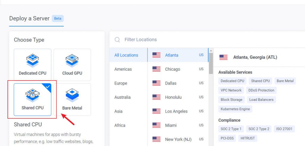 服务器类型选择Shared CPU,选择服务器位置。不同的服务器位置速度会有所不同。